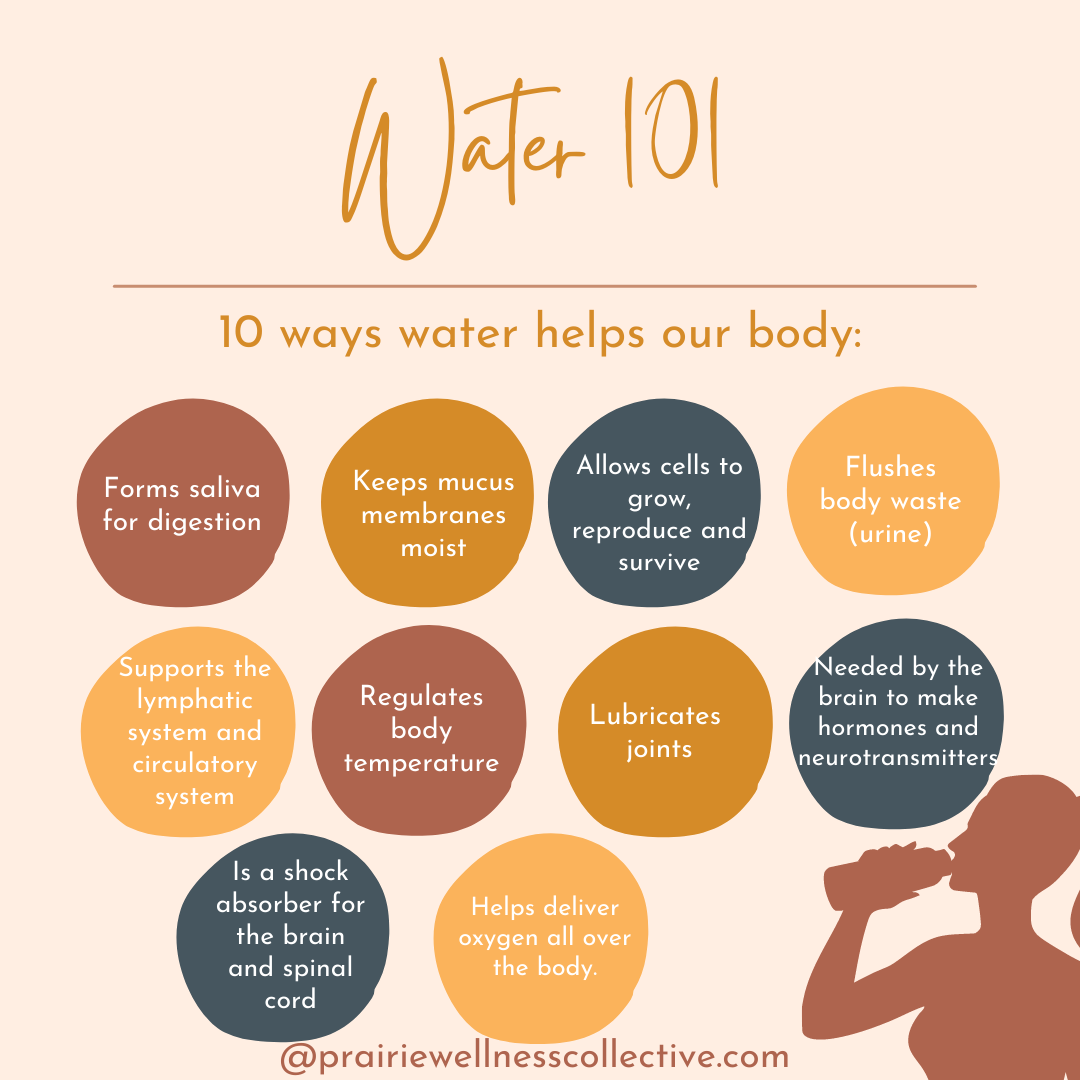 An adequate goal: consume for 1/2 our body weight in ounces of water throughout the day.